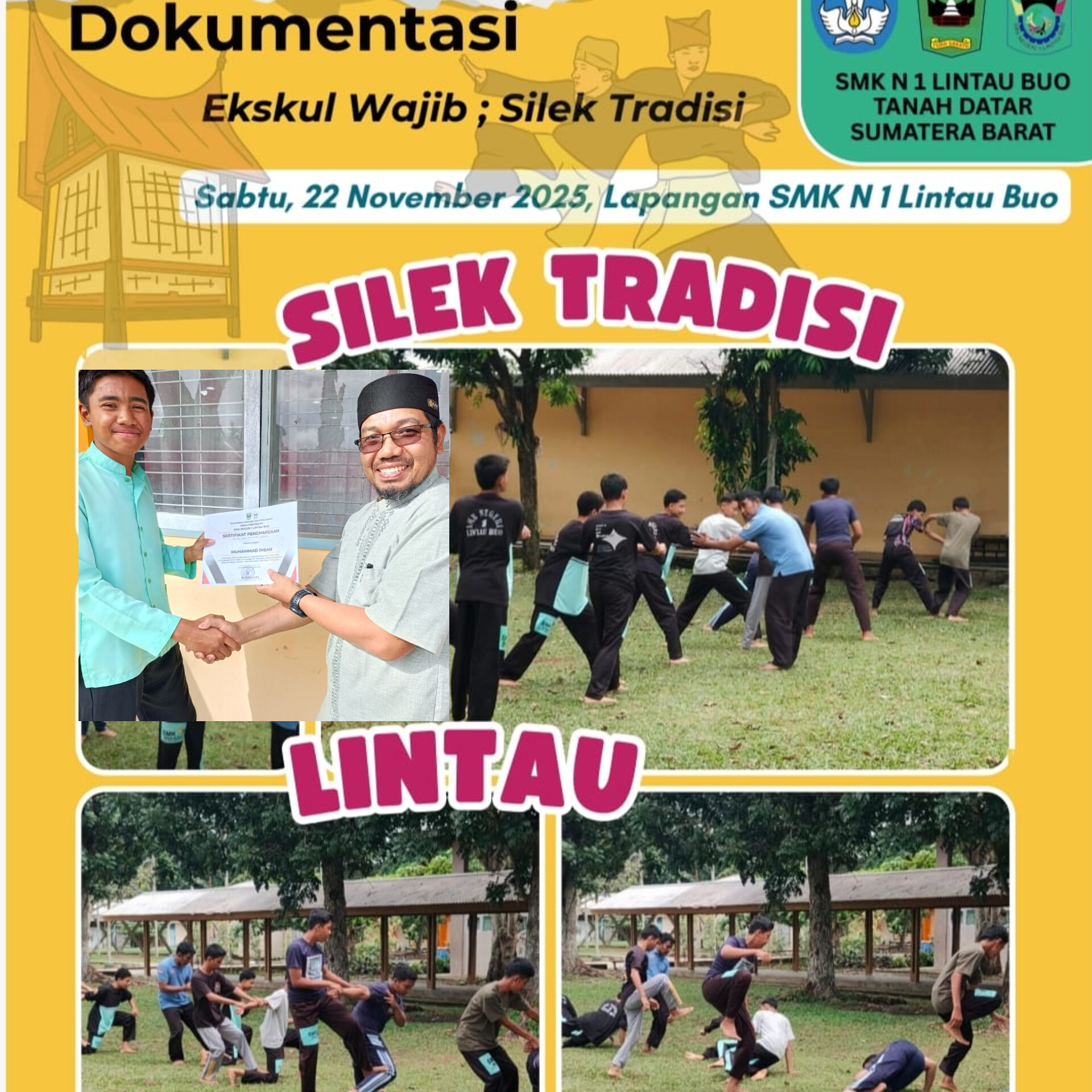 “Pemberian sertifikat penghargaan silat di SMKN 1 Lintau Buo,merupakan bentuk apresiasi sekolah kepada anak didik kami dalam keikutsertaan mereka selama ini atas program wajib pemerintah daerah Sumatera Barat,”saya berharap kepada para siswa yang mengikuti kegiatan pengenalan pencak silat tradisi,agar kedepannya dapat lebih memperdalam ilmu beladiri ciri khas Minangkabau ini di perguruan yang ada di nagarinya masing-masing.”katanya.